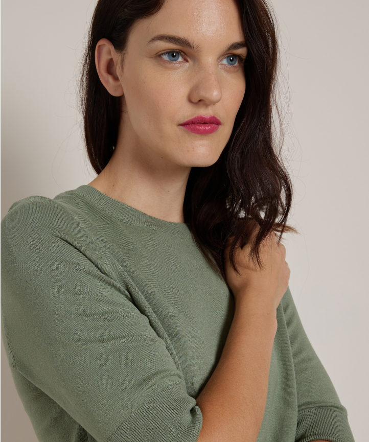 Trui voor dames. De trui is een basic model en is voorzien van een ronde hals, halflange mouwen en ribgebreide boorden. Verfraaid met een uni groene kleur. De trui heeft een regular fit pasvorm en draagt comfortabel dankzij de zachte stof.