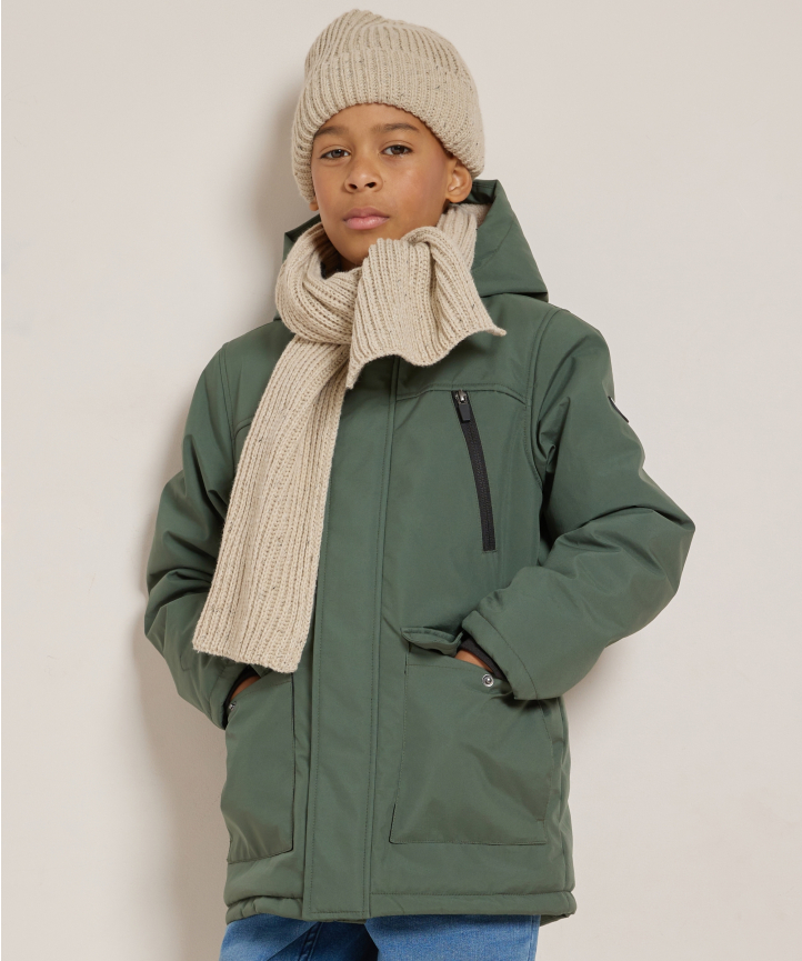 Sjaal voor jongens. De sjaal is een lang model en is voorzien van een ribstructuur met nappy structuur. Verfraaid met een beige kleur.