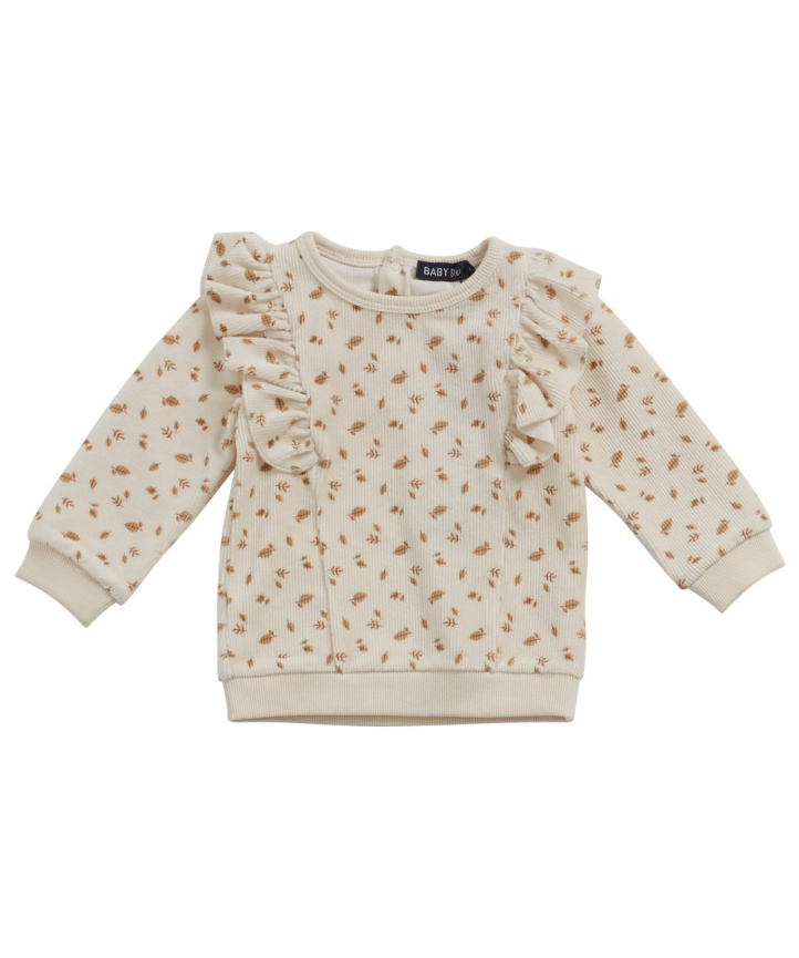 Trui voor baby meisjes. De trui is voorzien van een ronde hals met drukknoopsluiting aan de achterkant, lange mouwen, ribgebreide boorden en ruchestroken over de schouders. Verfraaid met een all-over rib velvet stof met bladerprint. De trui heeft een wijdere pasvorm en draagt comfortabel dankzij de stretch.