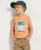 Singlet voor jongens. De singlet is voorzien van een ronde hals en brede schouderbanden. Verfraaid met een tekstuele print op een oranje kleur. De singlet heeft een regular fit pasvorm en draagt comfortabel dankzij de jersey stof.