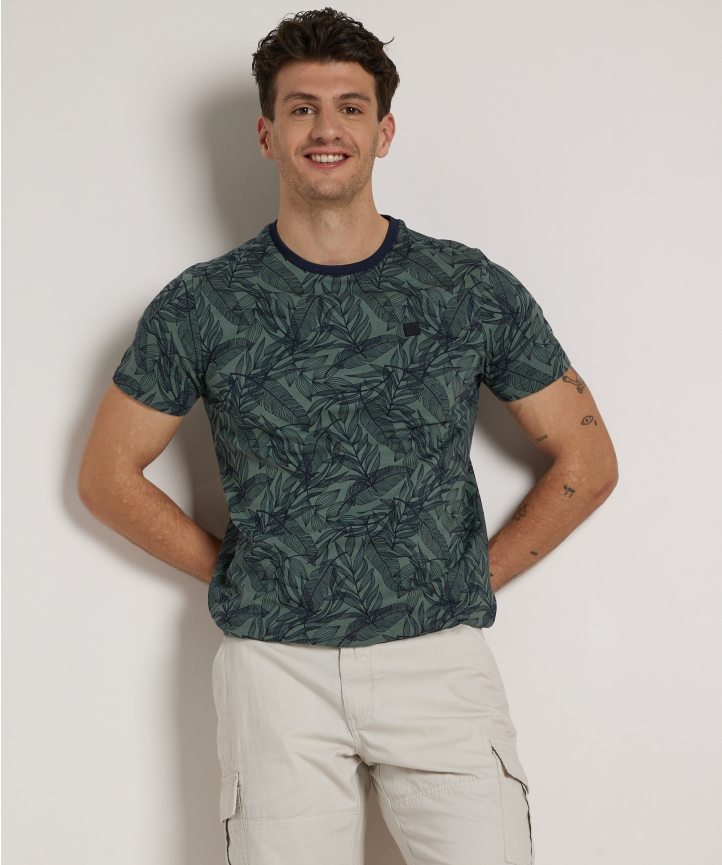 T-shirt voor heren. Het t-shirt is voorzien van een ronde hals en korte mouwen. Verfraaid met een all-over bladerprint op een groene kleur. Het t-shirt heeft een regular fit pasvorm en draagt comfortabel dankzij de jersey stof.