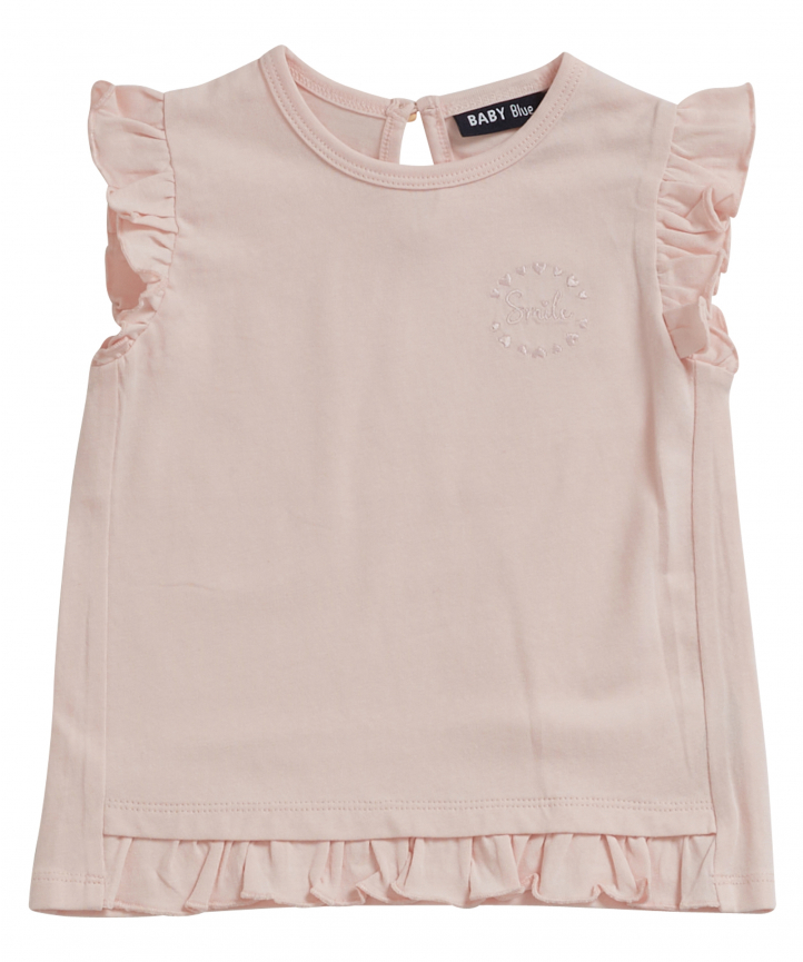 T-shirt voor baby meisjes. Het t-shirt is voorzien van een ronde hals met druppelsluiting aan de achterkant, korte ruche kapmouwen en een rucheboord aan de onderkant. Verfraaid met een zacht roze kleur. Het t-shirt heeft een regular fit pasvorm en draagt comfortabel dankzij de luchtige stof.