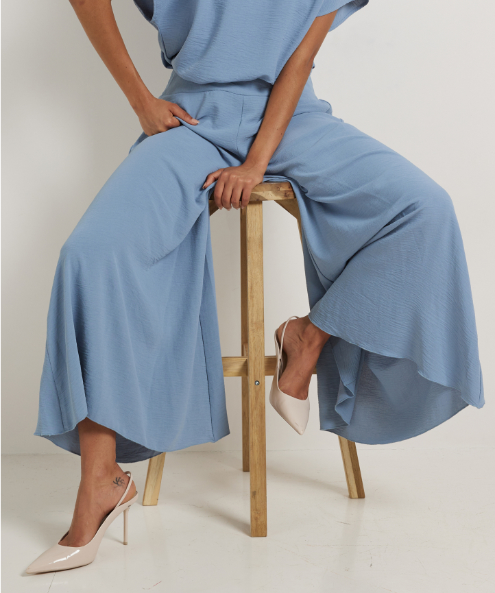 Broek voor dames. De broek is voorzien van een hoge tailleboord (high waist) met gesmockte achterkant. Verfraaid met een uni blauwe kleur. De broek heeft een wide fit met high waist pasvorm en draagt comfortabel dankzij de brede elastische boord en de soepele stof die luchtig aanvoelt tijdens het dragen. Een perfecte zomerbroek voor dames!